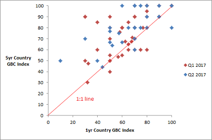 In January 2017, GeoWorld introduced the "Geotechnical Business Confidence Index". The index is intended to measure quarterly the short-term (1 year) and long-term (5-yr) expectations for business conditions in your company. All GeoWorld members are invited to participate. We ask you to answer the following questions quarterly: