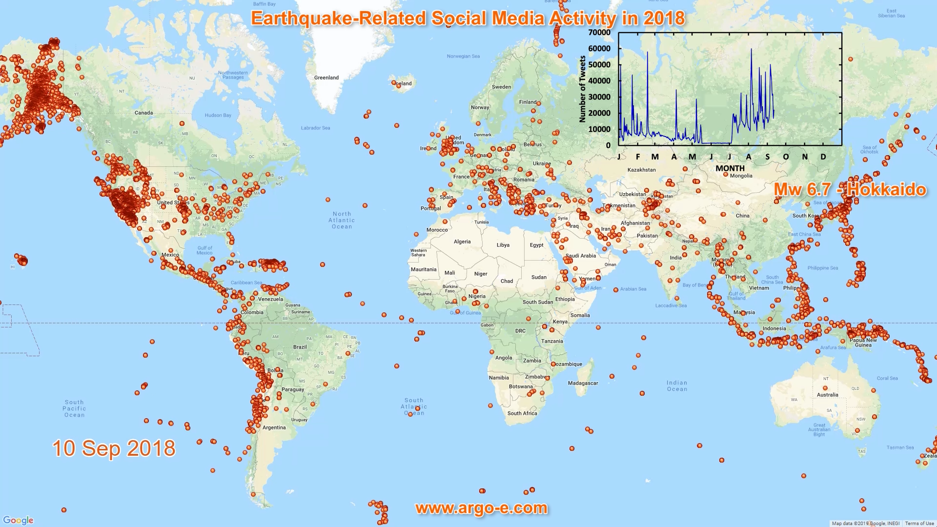 Watch our impressive 2018 earthquake map timeline and let us know what do you see at the end of the video! Find out more about our research team's work on earthquake related social media activity...