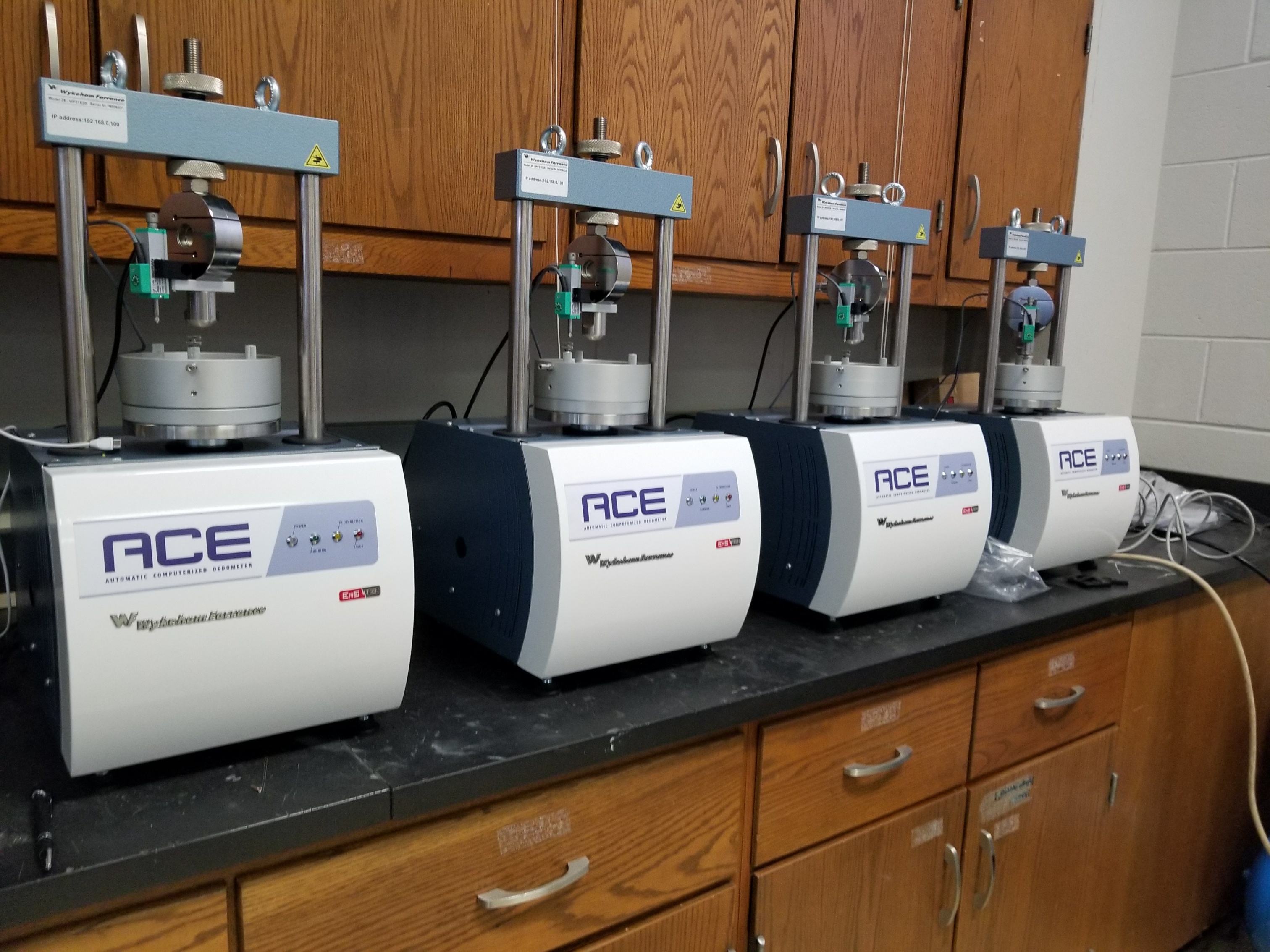 Newly installed WF Dynatriax EmS cylcic triaxial system and set of four ACE EmS automatic consolidation apparatus at University of Massachusetts, Lowell.
