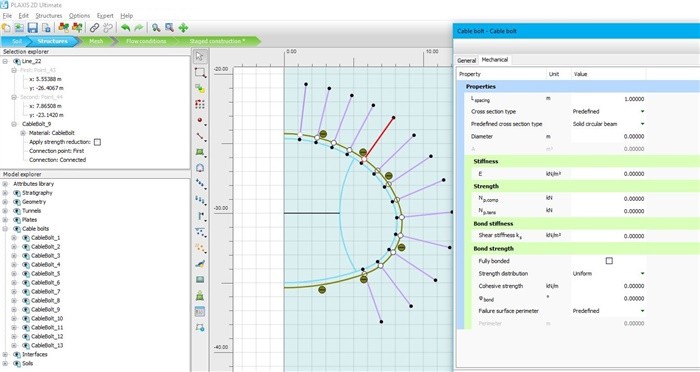 After the successful and well-received introduction of the discontinuity element in earlier releases, PLAXIS continues the path to offer understandable and easy-to-use functionality for rock and mining engineers. In this latest release, PLAXIS 2D V22 Update 2, the new cable bolt element and material type are introduced. Cable bolts can be used to simulate rock reinforcement like grouted cables or frictional/grouted bolts that work mostly in tension and/or compression.